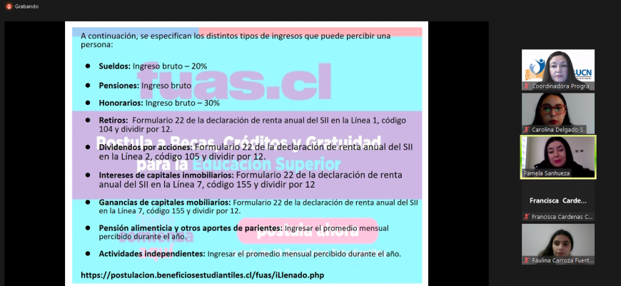 Padres y apoderados/as de estudiantes pertenecientes al Programa Propedéutico de la Universidad Católica del Norte (UCN) participaron en una reunión online para informarse sobre el proceso de postulación a ayudas estudiantiles que entregará el Ministerio de Educación para los y las estudiantes que ingresan en 2022 a la Educación Superior. El encuentro fue organizado por ese programa de inclusión social y estuvo a cargo de las asistentes sociales, Pamela Sanhueza y Paulina Carroza, de la Dirección General Estudiantil (DGE) de la UCN.