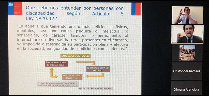 El profesional entregó la definición de persona con discapacidad que se incluye en la normativa chilena, que expresa que “es aquella que teniendo una o más deficiencias físicas, mentales, sea por causa física o intelectual o sensoriales, de carácter temporal o permanente, al interactuar con diversas barreras presentes en el entorno, ve impedida o restringida su participación plena y efectiva en la sociedad, en igualdad de condiciones con los demás”.