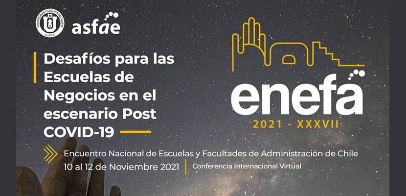 Debido a la pandemia por COVID-19, el XXXVII Encuentro Nacional de Escuelas y Facultades de Administración – ENEFA 2021 se desarrollará nuevamente de forma telemática entre los días 10 y 12 de noviembre de 2021.