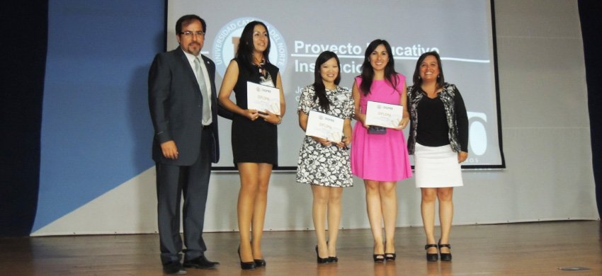 Juan Serín, Edgardo Cortés y María Elena Escudero, docentes de la Facultad de Medicina, por la innovación reconocida “Desarrollo de productos alimentarios innovadores: Integración del conocimiento en el área de alimentos en la carrera de Nutrición y Dietética de la UCN”. Hizo entrega la Secretaria Docente y Estudiantil de Sede, Carolina Fuentes Vega.
