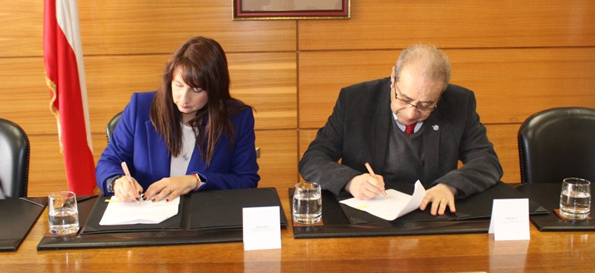 El acuerdo se suscribió en la Casa Central de la UCN, entre el rector Jorge Tabilo y la gerente de Recursos Humanos de Compañía Minera Lomas Bayas, Lorena Barraza.